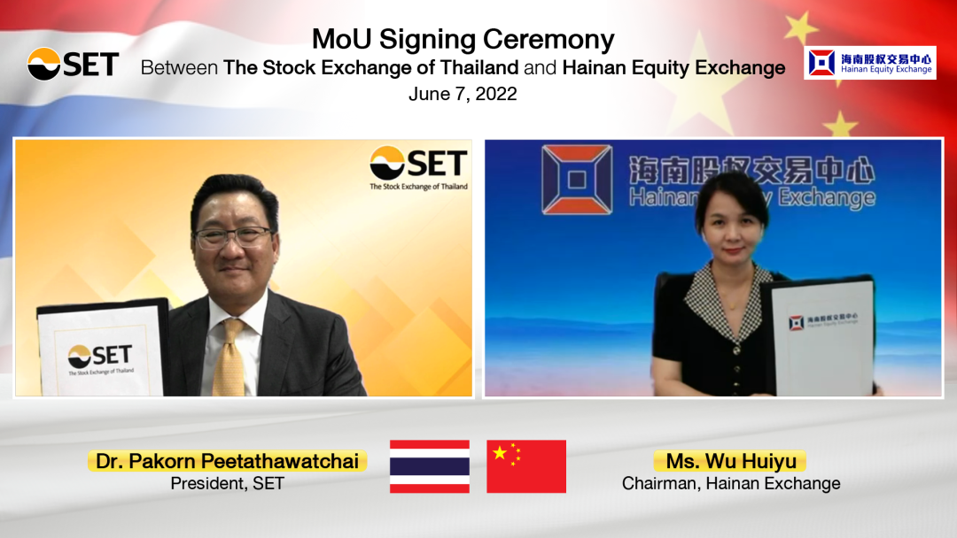 近日,海南股權交易中心與泰國證券交易所舉辦合作諒解備忘錄線上簽約儀式。海南股權交易中心董事長吳惠玉、泰國證券交易所總裁帕功·比達塔瓦猜(PakornPeetathawatchai)共同簽署《海南股權交易中心與泰國證券交易...