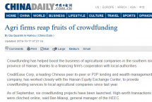10月17日,國家英文日?qǐng)?bào)《ChinaDaily》刊發(fā)文章《Agrifirmsreapfruitsofcrowdfunding》,對(duì)海南股權(quán)交易中心“眾籌海南”項(xiàng)目進(jìn)行了深入的報(bào)道。文章分析,“Crowdfundinghashelpedboostthebusinessofagriculturalco...