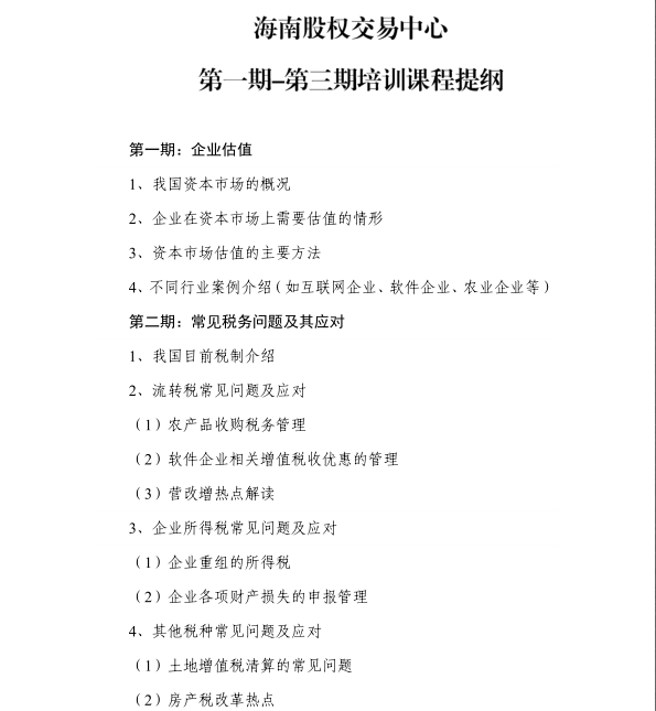 為幫助掛牌企業(yè)解決資金、稅收、以及管理上存在的諸多問題,提升企業(yè)的專業(yè)水平和管理水平,實(shí)現(xiàn)全方位成長壯大,海南股權(quán)交易中心(以下簡稱“股交中心”)掛牌企業(yè)培訓(xùn)班正式開班。首期培訓(xùn)班,股交中心特邀請中審亞太會計(jì)師事務(wù)所(特殊普通合伙)專家提供法律、財(cái)務(wù)和管理等方面的免費(fèi)培訓(xùn)服務(wù),通知如下: