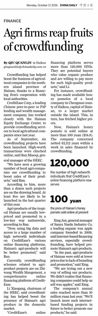 文章寫道,“CreditEase Corp, a leading Chinese peerto peer or P2P lending and wealth management company, has worked closely with the Hainan Equity Exchange Center, to provide crowdfunding services to local agricultural companies since last year. Agri-products of the tropical Hainan are usually lowpriced and promoted in a lowkey way nationwide, according to Ban. ‘Now, using big data and access to a large number of high networth individuals on CreditEase’s various online financing platforms,Hainan’s agriproducts will be better promoted, ’said Ban.”(譯注:互聯(lián)網(wǎng)金融領(lǐng)先企業(yè)宜信公司與海南股權(quán)交易中心密切合作,從去年開始為當(dāng)?shù)氐霓r(nóng)業(yè)公司提供眾籌服務(wù)。海南熱帶農(nóng)產(chǎn)品通常價(jià)格較低,在全國(guó)推廣的方式也很低調(diào),據(jù)班淼琦介紹,“現(xiàn)在,通過(guò)使用大數(shù)據(jù)和擁有大量高凈值人群的宜信在線融資平臺(tái),海南的農(nóng)產(chǎn)品將得到更好的推動(dòng)?!保?/span>