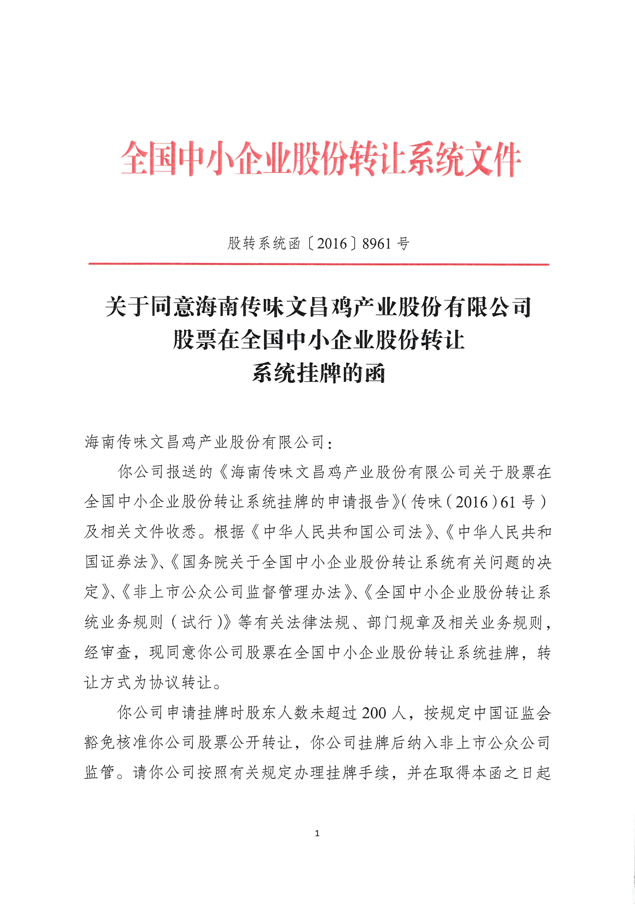 附:《關(guān)于同意海南傳味文昌雞產(chǎn)業(yè)股份有限公司股票在全國(guó)中小企業(yè)股份轉(zhuǎn)讓系統(tǒng)掛牌的函》