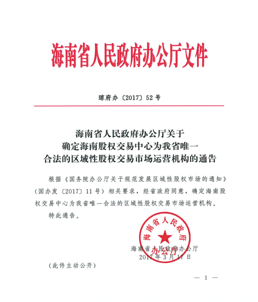 海南省人民政府辦公廳關(guān)于確定海南股權(quán)交易中心為我省唯一合法的區(qū)域性股權(quán)交易市場運營機構(gòu)的通告