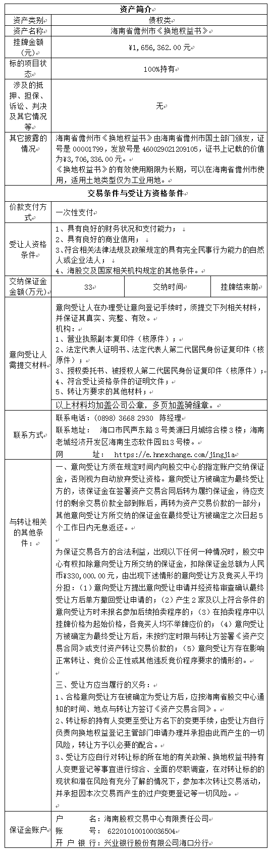 根據(jù)相關(guān)法律法規(guī),受委托,海南股權(quán)交易中心公開披露以下資產(chǎn)轉(zhuǎn)讓信息,廣泛征集受讓方。請有意者到我中心辦理受讓登記手續(xù)。