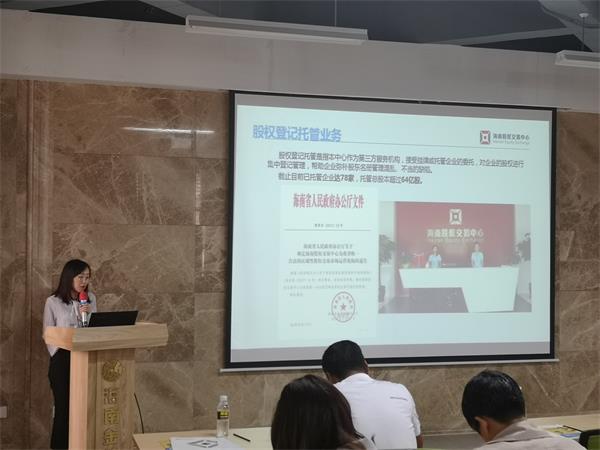 在隨后的業(yè)務(wù)宣講環(huán)節(jié),海南股交風(fēng)險(xiǎn)管理部、運(yùn)營(yíng)管理部、創(chuàng)新融資部就掛牌企業(yè)合規(guī)若干規(guī)定、年報(bào)披露以及股權(quán)轉(zhuǎn)讓、股權(quán)質(zhì)押、定向增資、可轉(zhuǎn)債業(yè)務(wù)等內(nèi)容為參會(huì)的15家企業(yè)進(jìn)行了專題宣講。