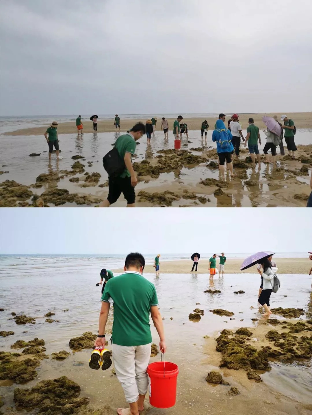 在聽完趕海內容及注意事項講解后,大家三三兩兩,組隊而行,邊呼吸著海邊清新的空氣,邊欣賞沿岸廣袤的淺海灘風景,體驗逐浪趕海。