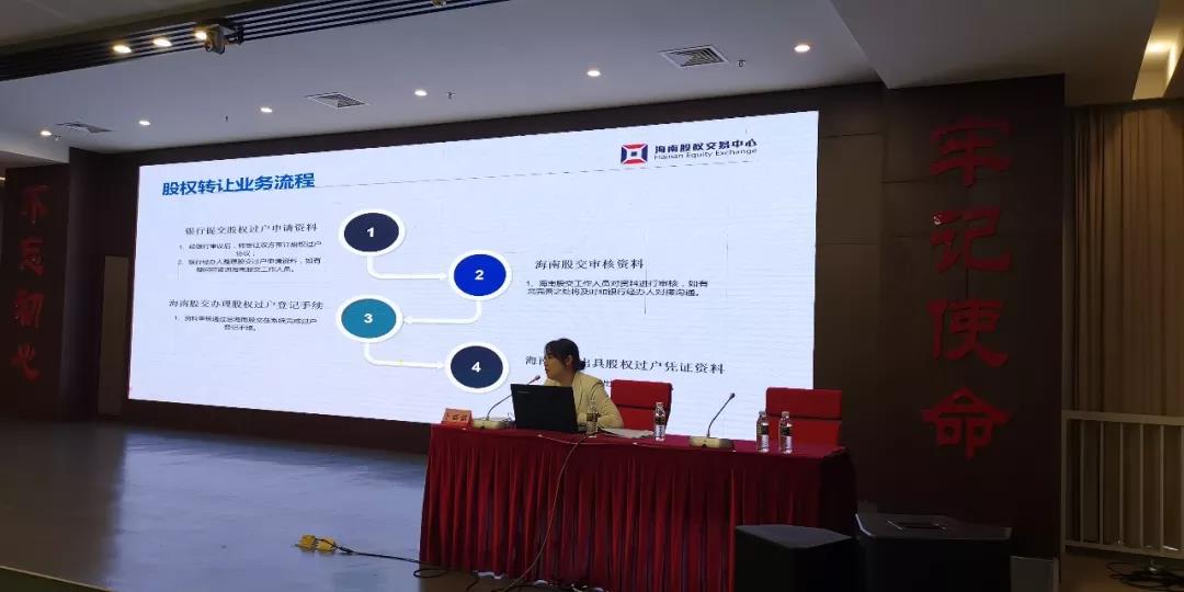 培訓(xùn)會上,海南股交總經(jīng)理助理卜麗麗向現(xiàn)場參會人員介紹了商業(yè)銀行股權(quán)登記托管的重要性和必要性。她表示,股權(quán)登記托管是區(qū)域性股權(quán)交易市場的一項基礎(chǔ)工作,也是主要業(yè)務(wù)之一。海南股交作為省內(nèi)唯一合法的區(qū)域性股權(quán)交易市場運營機構(gòu),成立至今,股權(quán)托管企業(yè)共計90家,托管總股本達(dá)67.05億股,積累了豐富的股權(quán)托管工作經(jīng)驗。2018年,海南銀行股份有限公司在海南股交成功辦理股權(quán)登記托管手續(xù),成為省內(nèi)首家完成股權(quán)登記托管的法人銀行,標(biāo)志著海南省銀行股權(quán)登記托管業(yè)務(wù)實現(xiàn)零的突破。