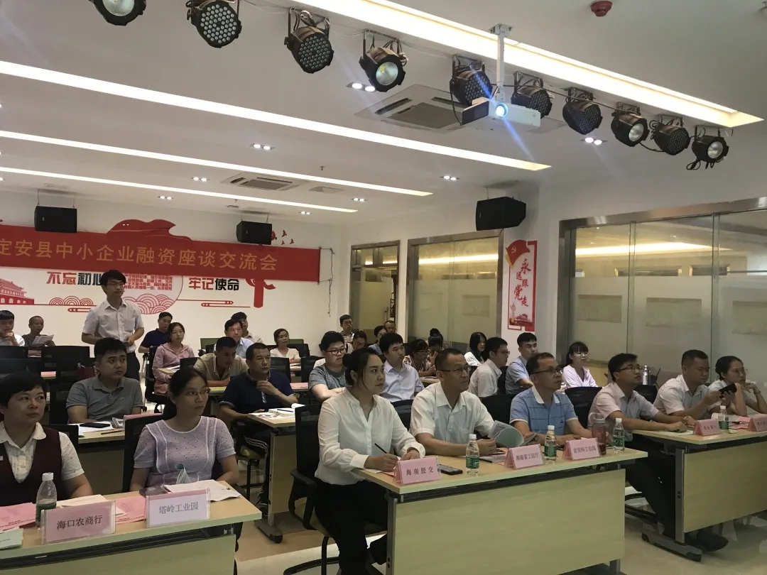 海南省工業(yè)和信息化廳、定安縣科工信局、定安塔嶺工業(yè)園等相關部門、園區(qū)負責人,中國農業(yè)銀行、中國建設銀行、中國郵儲銀行、海南銀行、??谵r商行、??谑腥谫Y擔保、海金控擔保、信聯(lián)盛擔保、定安擔保等金融機構代表及定安中小企業(yè)代表共約50人參加交流會。