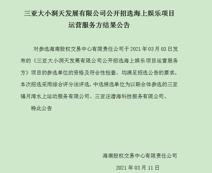 三亞大小洞天發(fā)展有限公司公開招選海上娛樂項(xiàng)目運(yùn)營服務(wù)方結(jié)果公告