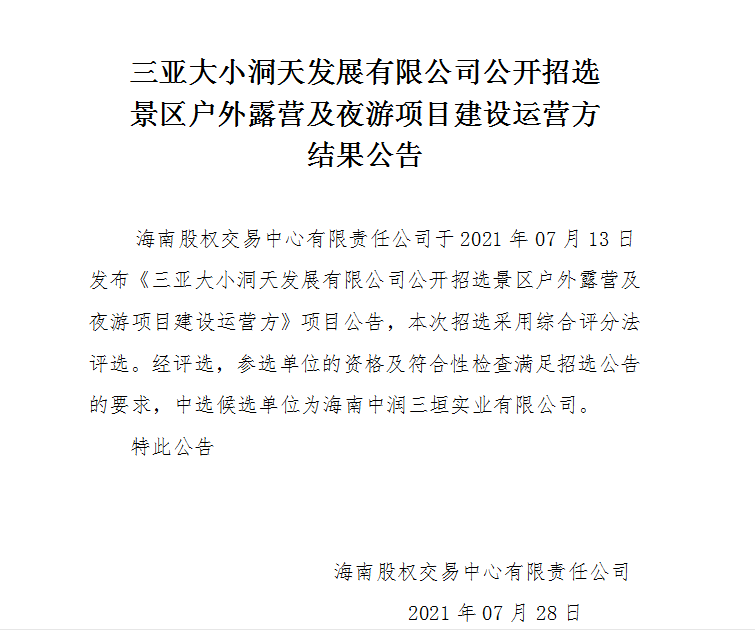 三亞大小洞天發(fā)展有限公司公開招選景區(qū)戶外露營及夜游項(xiàng)目建設(shè)運(yùn)營方結(jié)果公告