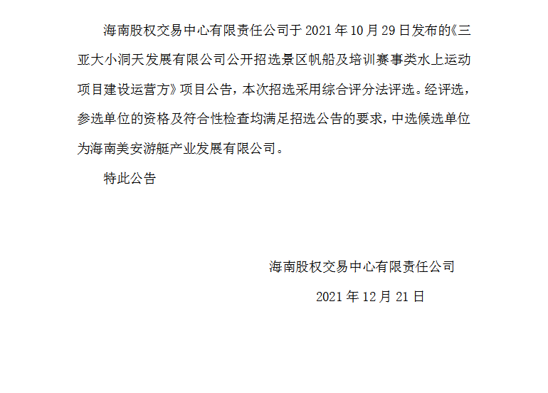 三亞大小洞天發(fā)展有限公司公開招選景區(qū)帆船及培訓賽事類水上運動項目建設運營方結果公告