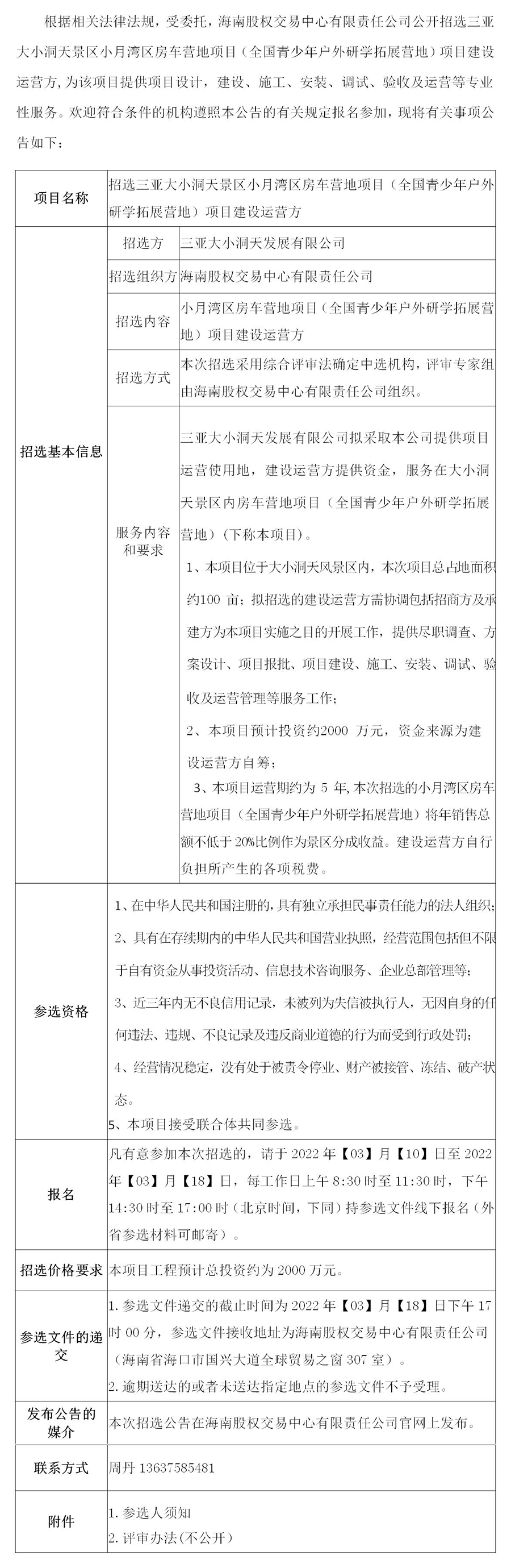 三亞大小洞天發(fā)展有限公司公開招選小月灣區(qū)房車營地項目(全國青少年戶外研學拓展營地)建設運營方
