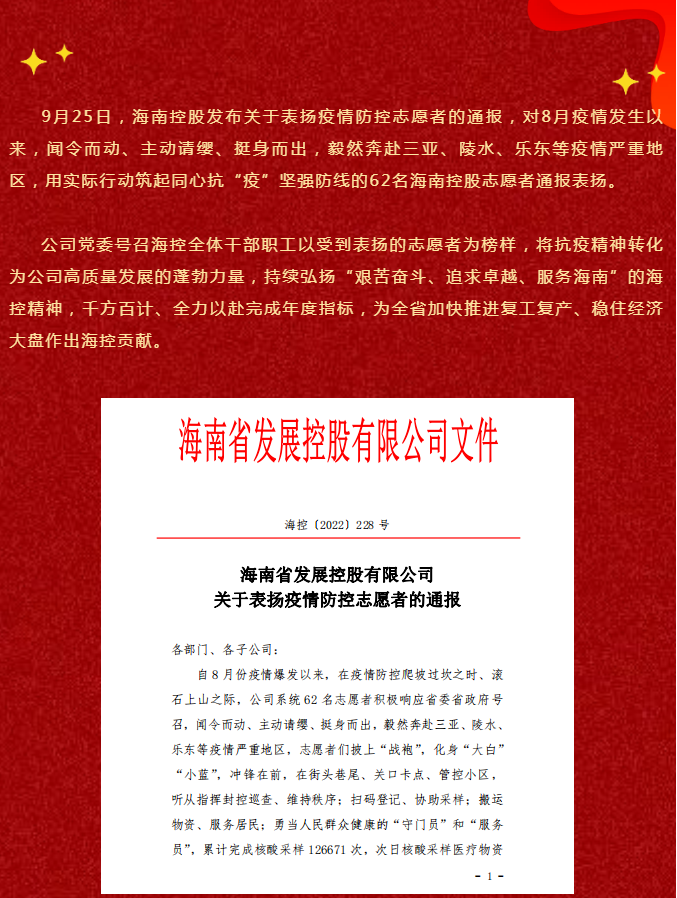 海南控股通報(bào)表?yè)P(yáng)62名疫情防控志愿者