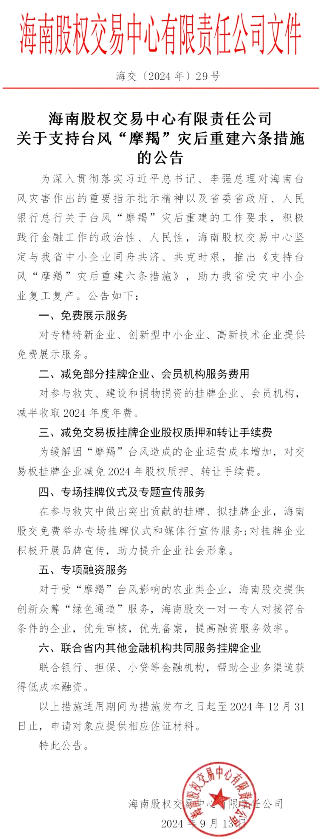 海南股權(quán)交易中心將深入了解受災(zāi)中小企業(yè)影響情況以及各方面的需求,充分發(fā)揮綜合金融服務(wù)平臺(tái)作用,幫助企業(yè)對(duì)接省內(nèi)其他金融機(jī)構(gòu),全力解決企業(yè)資金周轉(zhuǎn)難題,為堅(jiān)決打贏災(zāi)后重建攻堅(jiān)戰(zhàn),助力我省中小企業(yè)恢復(fù)生產(chǎn)經(jīng)營貢獻(xiàn)力量。